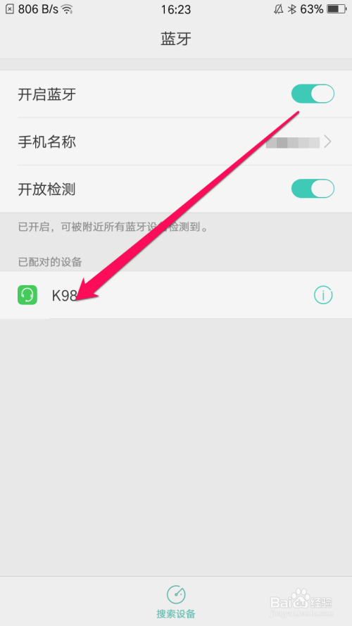 然后再在手机中打开蓝牙功能检测四周开启蓝牙的旌旗灯号(蓝牙设备属于蓝红的状况)。