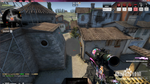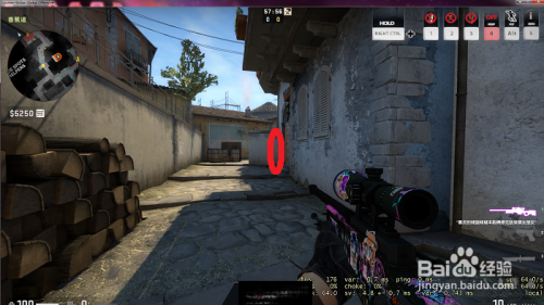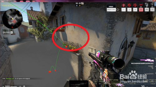 接着,我们把准心从上方的阳台的角处往下拖到墙的边缘靠下一丢丢的位置。