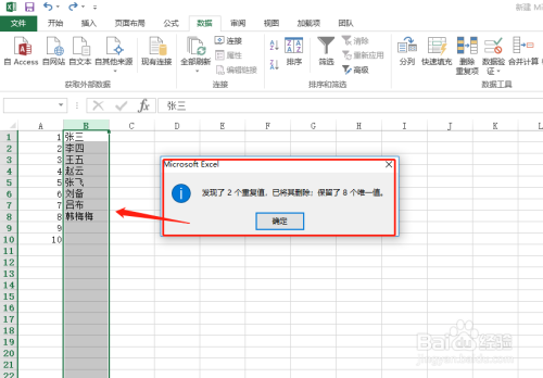 接着,会弹出一个【删除反复项】的提醒框,在此处默认会勾选之前选中的第二列,直接点击【确定】按钮