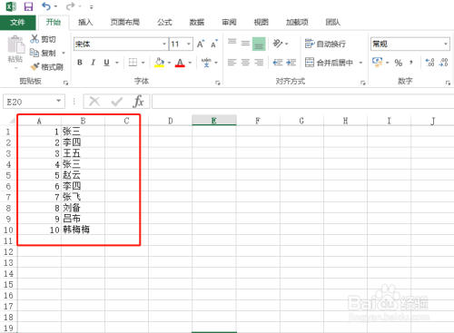 在电脑的任何位置新建一个excel空白文件,本文以excel2013为例演示。新建完当作后,在第一列插入1到10的10个数字序号,在第二列插入有反复值的演示数据,本文仅做演示,所以,插入的行数不多