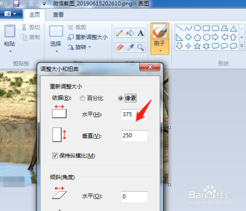 然后,将图片素材用电脑自带的绘图软件打开,调整像素大小。像素凡是需要缩小至400x300以下,这里设置为375x250。