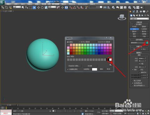 打开3Dmax2012软件,点击【建立】-【几何体】-【球体】,在作图区域绘制一个球体模子。选中球体,点击【对象颜色】将模子的对象颜色设置为:白色;