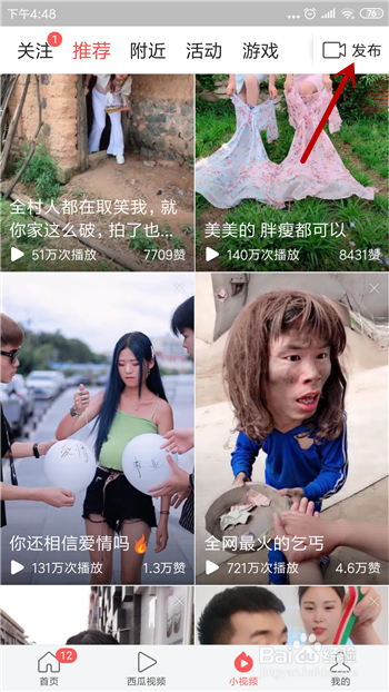 我们需要进入拍摄界面添加贴纸,点击右上角的【发布】按钮。