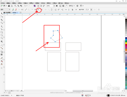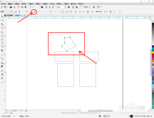 点击【钢笔东西】在作图区域绘制一个多边图案。点击【外形东西】框选图案上所有节点后,点击【转化为曲线】将节点转曲。完当作后,选中图示图案上的节点,点击【光滑节点】将节点进行光滑处置并调整好节制点(如图所示);