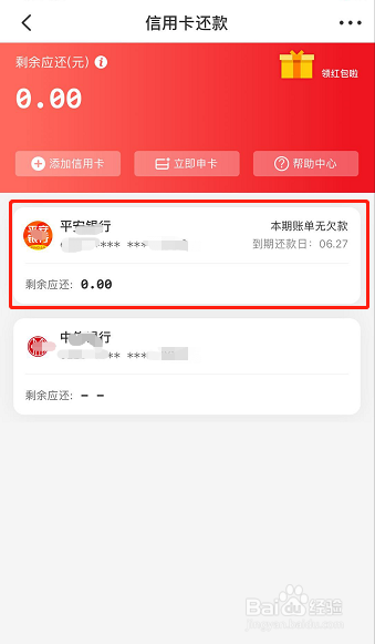 点击后页面进入信用卡还条目本家儿页,如图所示。在本家儿页下选择想要设置还条目提醒日期的信用卡,点进该信用卡!