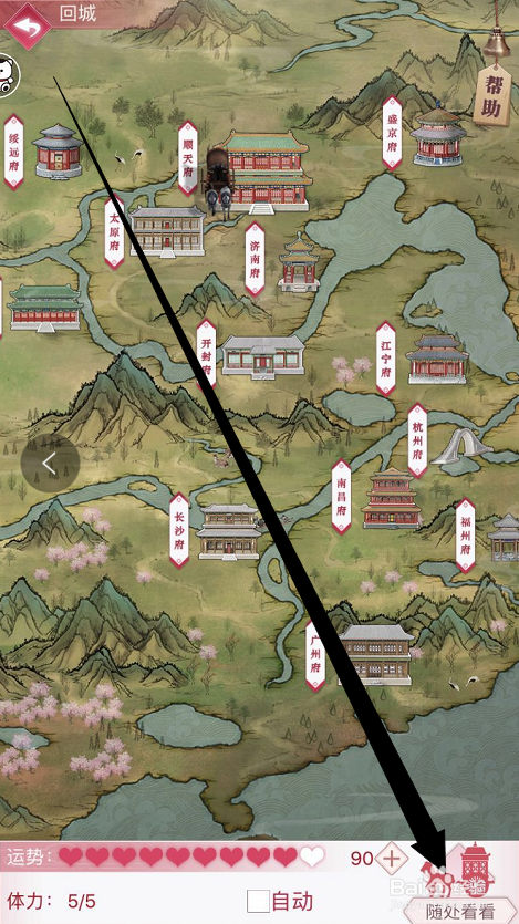 进入到出城页面之后,可以看见今朝已经解锁获得地址,以及运势环境和体力环境,可以看见今朝的体力是五个满格的,点击右下角的到处看看按钮。