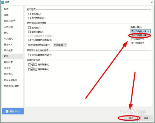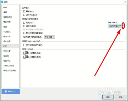 在“选项”的对话框右侧“打印文档的附加信息”区域找到“埋没文字”,单击厥后面的下拉按钮