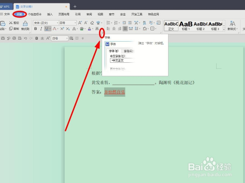 选中谜底文字,找到“起头”选项卡下面的“字体”选项组按钮单击