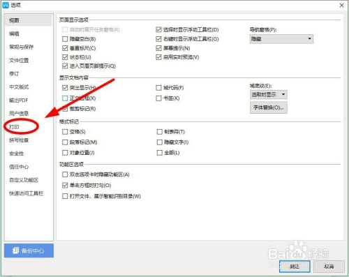 在弹出的“选项”对话框中,找到并单击“打印”
