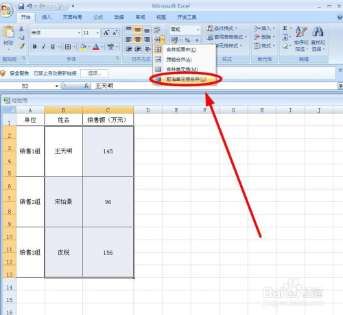 鄙人拉菜单中选择“打消单位格归并”单击