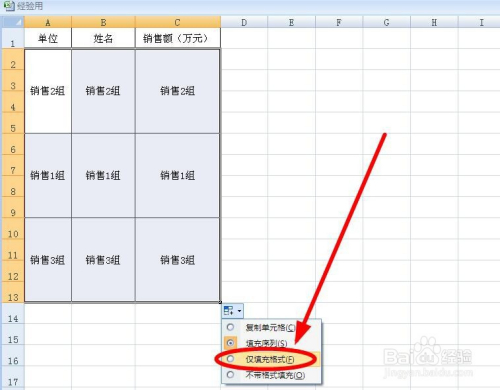 我们只要单位格格局,不想把内容复制过来,是以需要在“主动填充选项”上单击