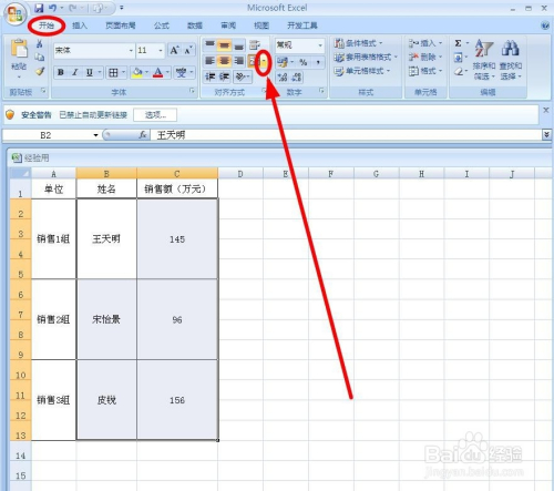 选中B、C列响应单位格区域,找到“起头”选项卡下的“归并后居中”按钮后面的下拉按钮