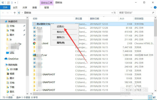 鼠标右键选中该文件,选择此中的“还原”按钮,就可以将删除在收受接管站中的文件恢复了,如图所示。