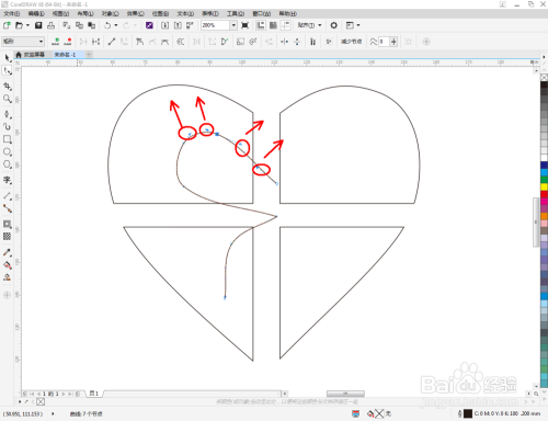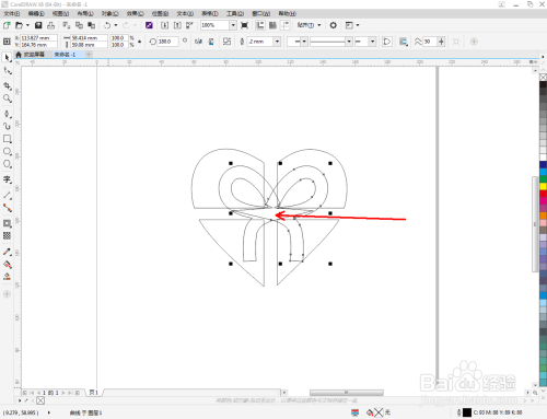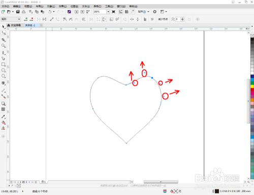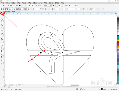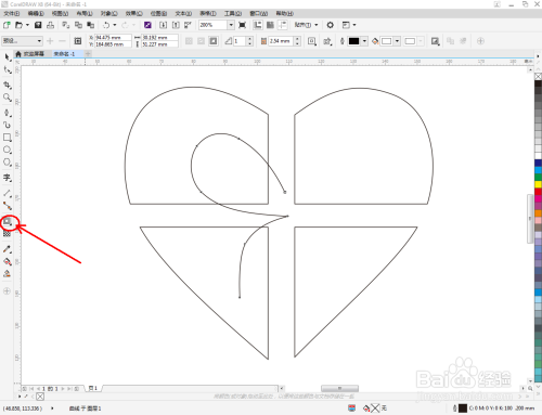 点击【钢笔东西】,按图示绘制出一条线段图案。点击【外形东西】,框选所有的节点后,点击【转化为曲线】将节点转曲。完当作后,选中图示图案上的节点,点击【光滑节点】将节点进行光滑处置并调整好节制点(如图所示);