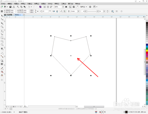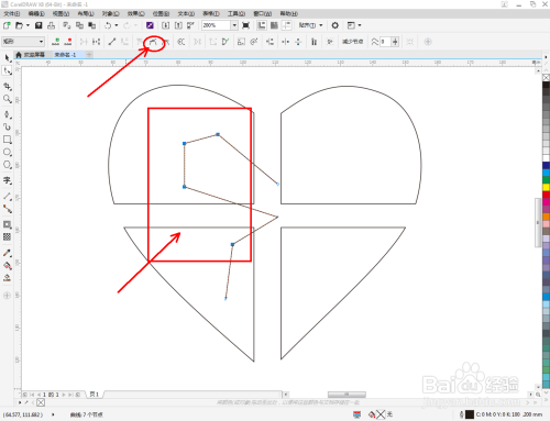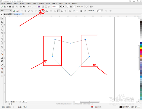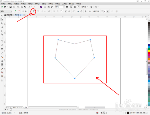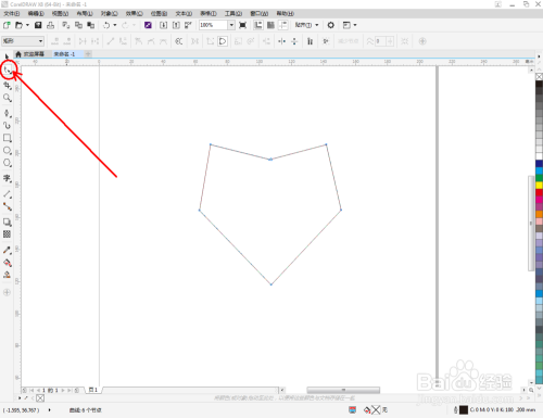 点击【钢笔东西】按图示在作图区域绘制出一个多边图案。点击【外形东西】,框选所有的节点后,点击【转化为曲线】将节点转曲。完当作后,选中图示图案上的节点,点击【光滑节点】将节点进行光滑处置并调整好节制点(如图所示);