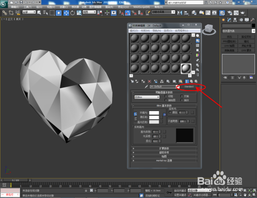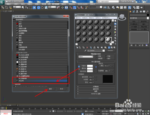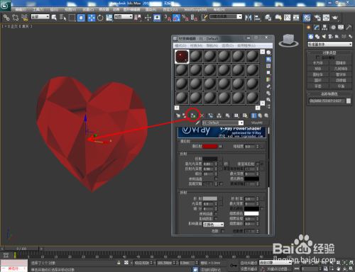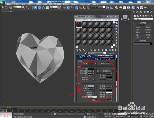 点击【材质编纂器】,弹出材质编纂器设置框,点击【standard】-【VAryMlt】设置一个Vary材质球,按图示设置好【反射】与【折射】中的各个参数,建造出一个红宝石材质球。完当作后将材质球附加给模子(如图所示);