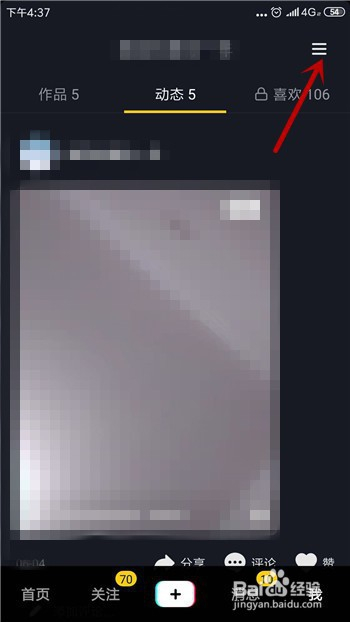 在抖音的小我本家儿页中点击右上角的【三】按钮,如图所示。