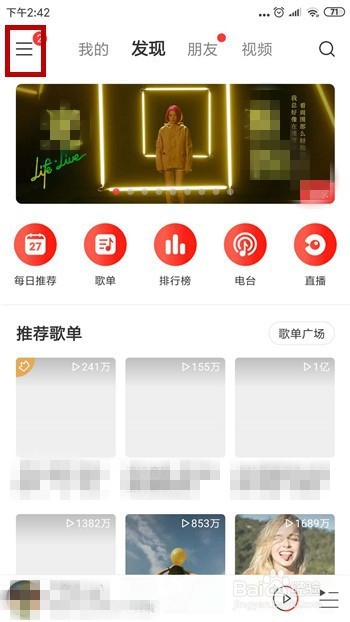 打开手机中的网易云音乐,在首页里点击左上角的【三】选项,如图所示。