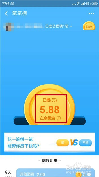 然后我们打开笔笔攒,此时可以看到我们的余额里已经多了一笔钱,这个就是攒下来的金额。