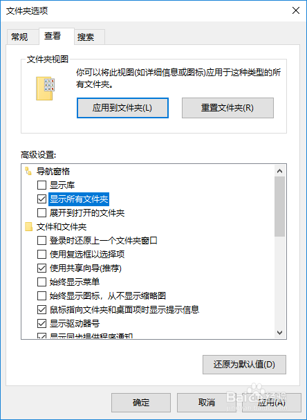 勾选对话框中的“显示所有文件夹”复选框,并点击“确定”按钮。