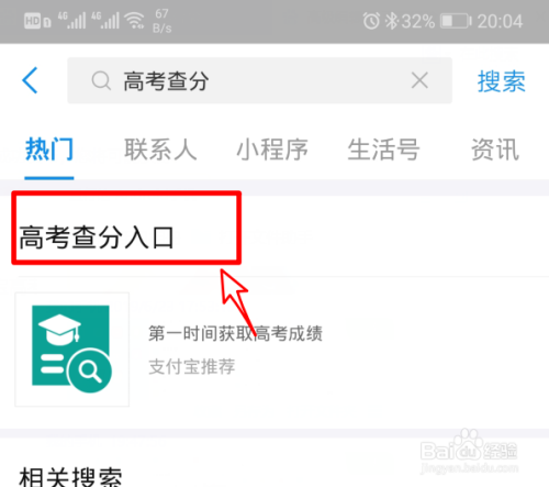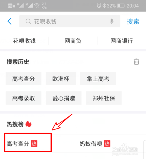 点击后鄙人方的热搜榜中选择高考查分的选项,也可以输入进行搜刮。