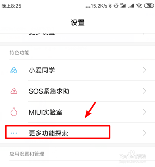 在手机设置列表中,选择更多功能摸索的选项。