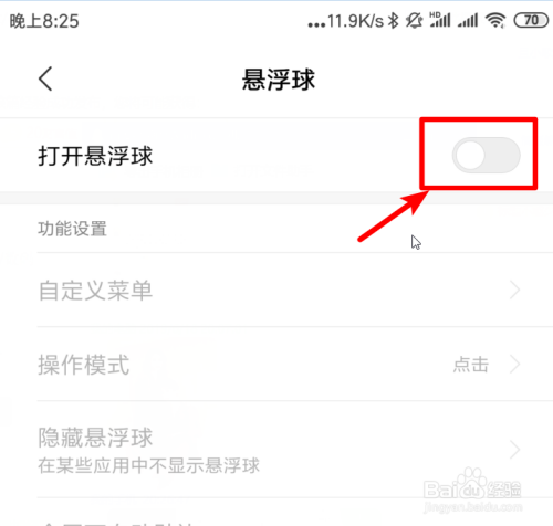 点击后,将打开悬浮球后方的开关打开。