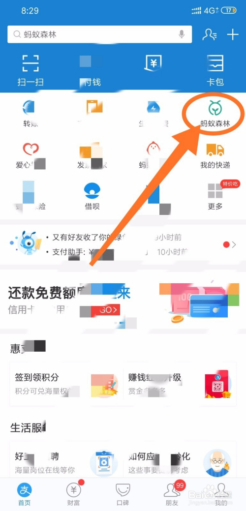 进入支付宝之后,在首页找到“蚂蚁丛林”,点击进入此中;