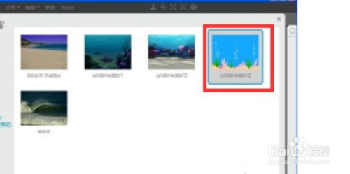 4打开布景库,在本家儿题里选择“水下”,找到一张布景图后按确定,