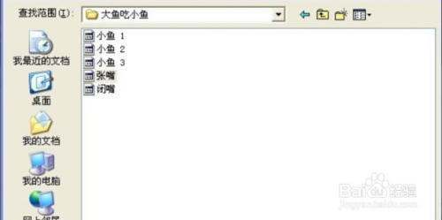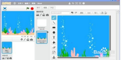 6然后打开从当地文件夹中上传脚色,将脚色(张嘴的大鱼和三条小鱼)导入到Scratch2.0中,