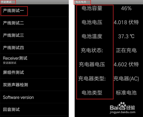 点击“手动测试”中“产线测线一”可以查看电池容量,电压,电池温度,充电状况,充电器电压 充电器类型,电池类型.
