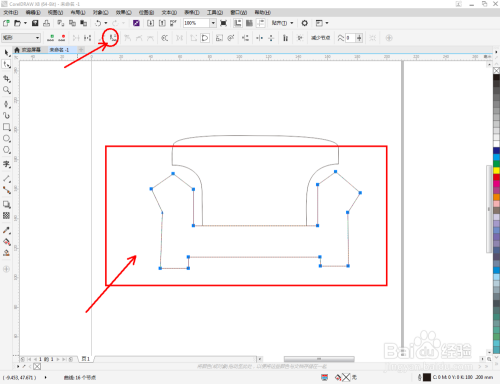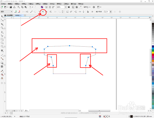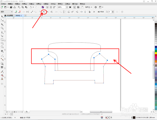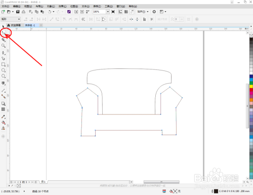 点击【钢笔东西】按图示在作图区域绘制出一个多边图案。点击【外形东西】,框选所有的节点后,点击【转化为曲线】将节点转曲。完当作后,选中图示图案上的节点,点击【光滑节点】将节点进行光滑处置并调整好节制点(如图所示);