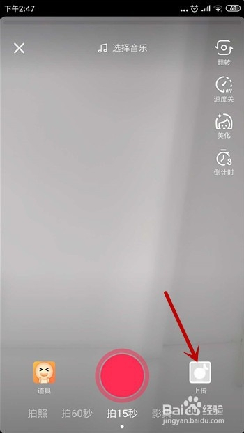 在抖音的视频录制界面里点击右下角位置的【上传】打开手机相册界面。