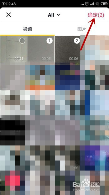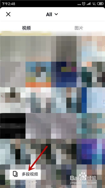 然后在【视频】的下方可看到手机里的视频,此时点击左下角位置的【多段视频】。
