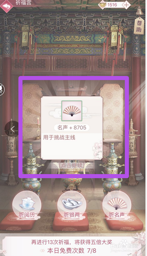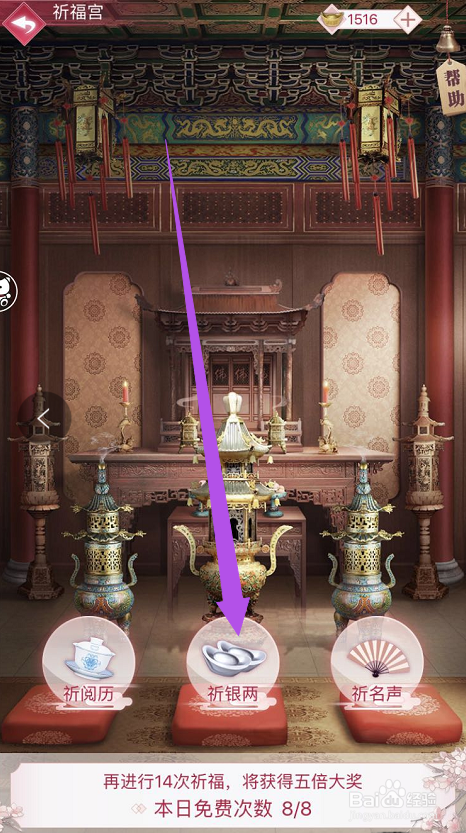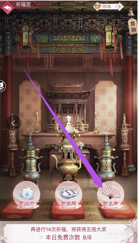在祈福宫页面内可以看见这一页面内有良多的鼎,页面底部门别有祈阅历、祈银两和祈名声三个按钮,想要祈求哪一个就点击响应的页面,例如想要祈名声的话就点击最后一个页面。