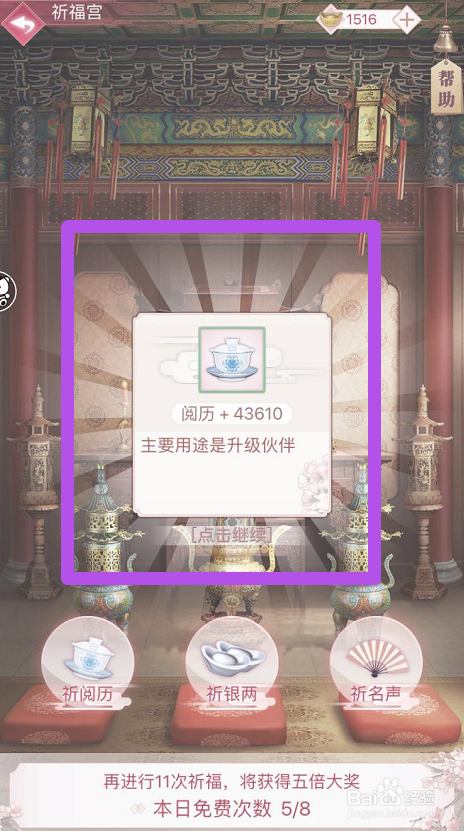 想要祈求阅历,就点击第一个按钮祈阅历,然后就会获得阅历的奖励了。
