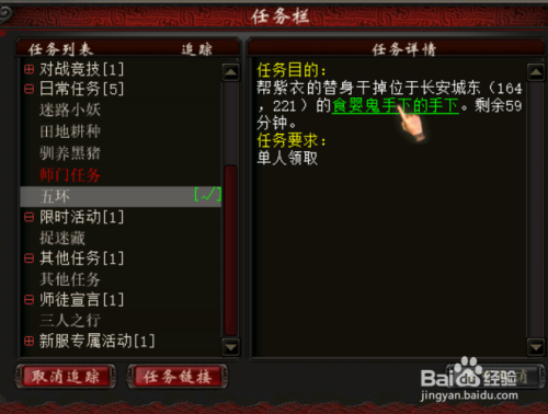 找到”紫衣的替身“后,点击她,呈现新的使命,继续点击绿色字“食婴鬼手下的手下”,会主动寻找,如图所示