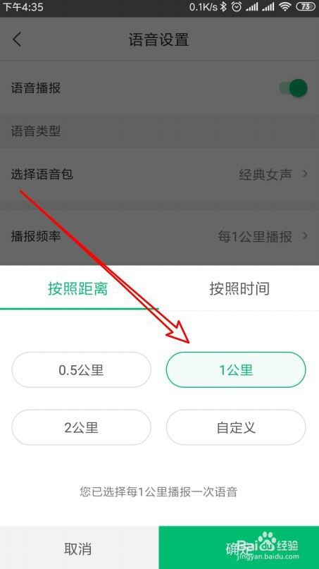 这时就会打开陈述频率的设置菜单,按照距离设置中我们选中播报的距离按钮,最后点击确定按钮就可以了