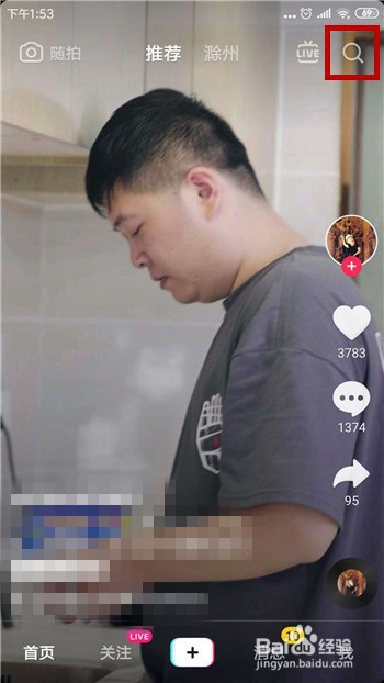 我们可以利用同条目道具的方式去找到这个特效,在抖音里点击右上角【搜刮】。