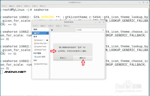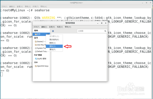 默认root用户在终端中输入号令seahorse (如图,别打错字)
