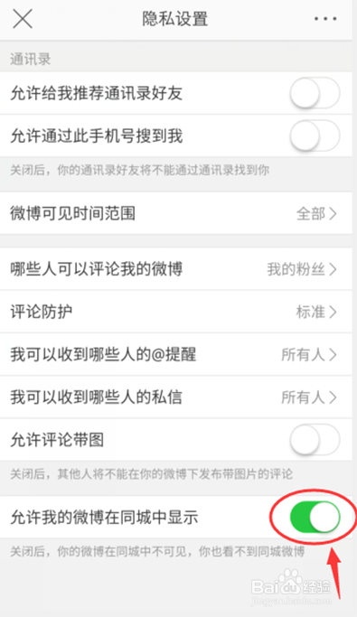 进入隐私设置页面,在最下方,封闭【许可我的微博在同城中显示】。