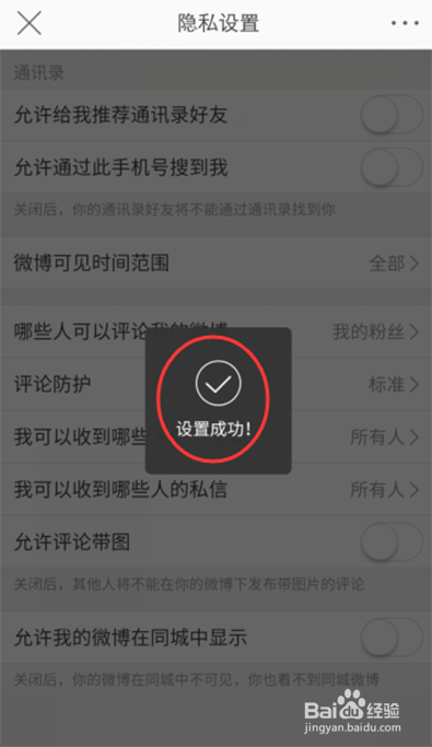 完当作后,呈现“设置当作功”对话框,这样到时你的微博就不会在同城中显示了。