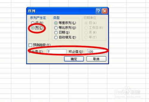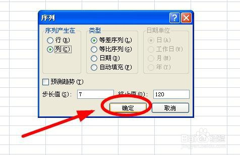 “类型”中默认的就是等差序列,所以直接不动。在步长值和终止值后面别离填入要求的数字“7”“120”