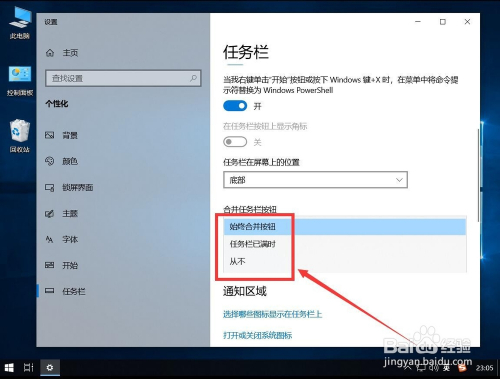 如图,弹出的下拉菜单中,可以选择“使命栏已满时”和“从不”