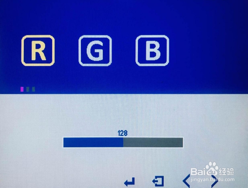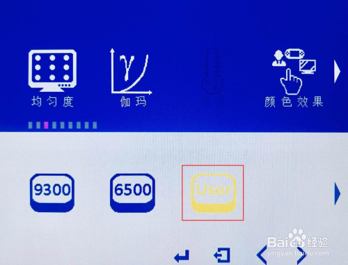(2)这里别离有“9300”和“6500”2个出厂预设,以及一个自界说“User”,如“9300”和“6500”都不是你要的色温,可以选择进入“User”调节RGB三原色。经由过程按④或⑤键进行调节