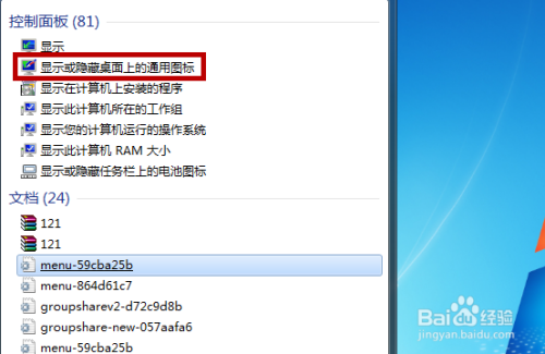输入后我们可以在上方看到良多的搜刮成果,点击此中的【显示或埋没桌面上的通用图标】。
