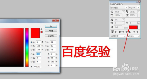 用鼠标点击选择最上面的图层,然后如图,点出字符/段落窗口,点击颜色,呈现选择文本颜色,选择好心怡的颜色后,点击好。