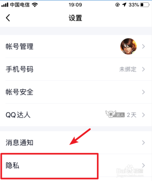 进入手机QQ设置界面后,我们选择隐私的选项进入。