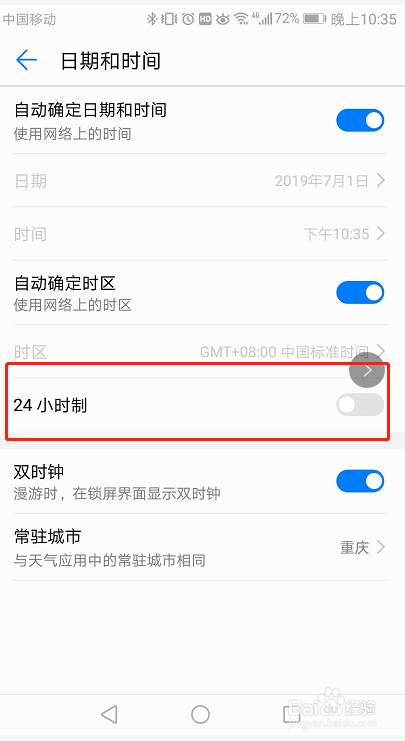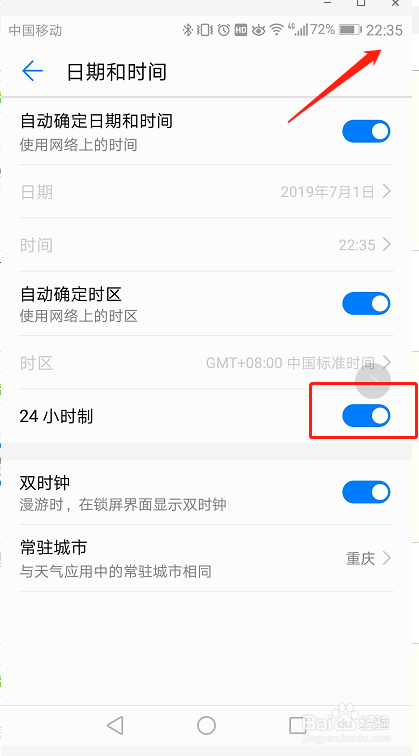 打开24小时制右侧开关,这时辰你会发现右上角的时候酿成了24小时制的格局