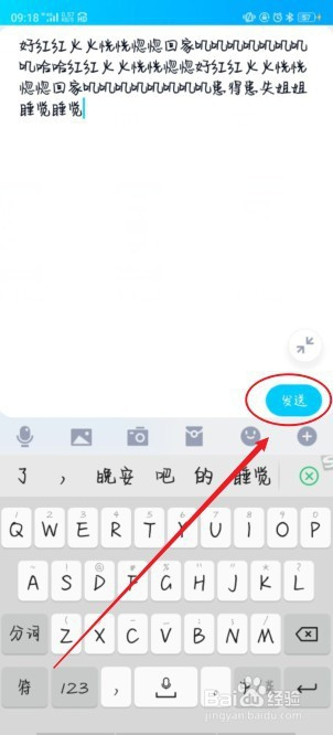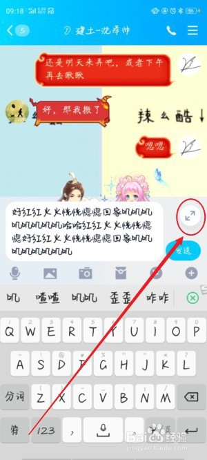 在进行输入文字时,输入大量的文字信息时,右边就会显示出一个扩大按钮,我们点击这个按钮,即可全屏输入文字,文字输入完后,点击发送按钮即可,如图所示。